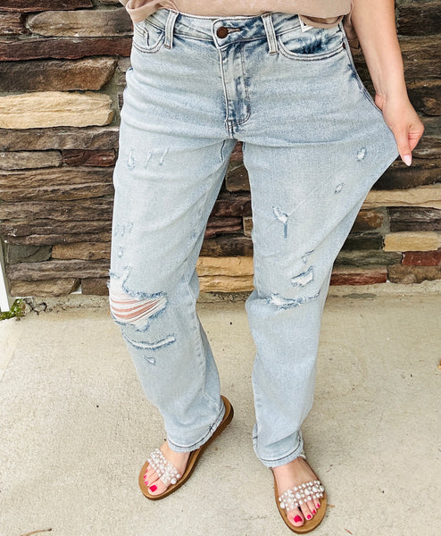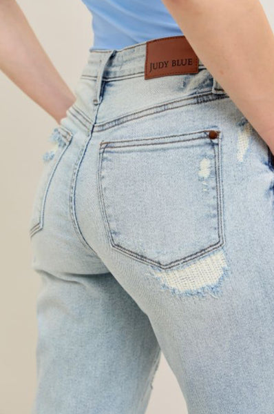 Light wash, distressed, high-waisted, and so stretchy you might actually question if they’re jeans or sorcery. We’re talking size-down-two-sizes kind of stretch—yeah, that good.