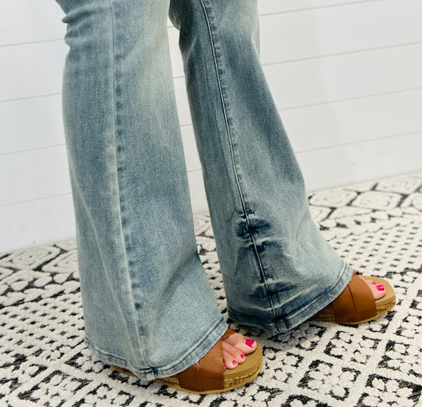 ✨Judy Blue Comfort Stretch! ✨Mid Rise ✨33” inseam (I have on regular Corky wedges) ✨True Flare (flattering on ALL body types) ✨Vintage wash (blends so well with allllll the Fall colored tops)