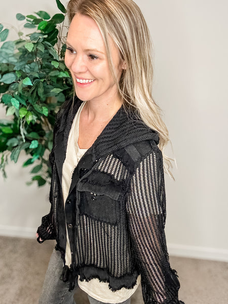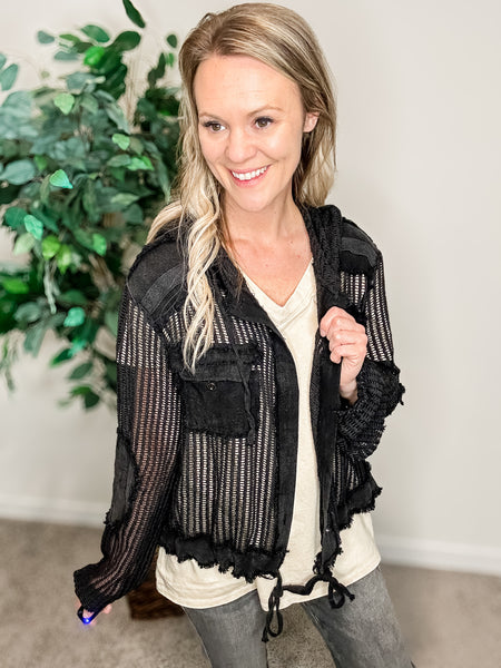 This POL button down is lightweight, textured, and has that perfectly lived-in feel, plus a loose fit with adjustable drawstring ties at the hem so you can wear it relaxed or cinch it in for a more tailored look. The hood, subtle sheer details and raw edges give it that effortless cool vibe.